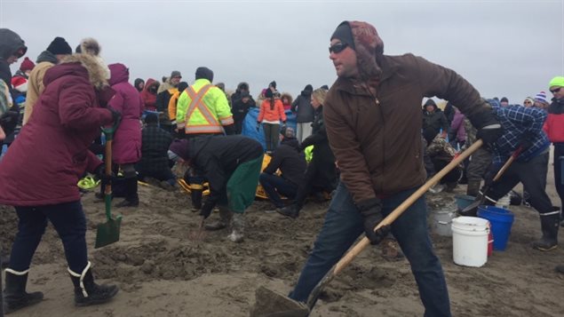 小镇上的人也不畏寒冷,纷纷前往海滩参加救援。有人把水倒在鲸鱼身上,其他人则试图在沙滩上挖出一条水路。