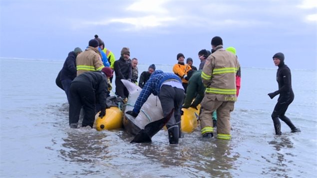 海洋动物保护协会(MARS)很快抵达现场。他们带来了一个充气筏,在众人帮助下把充气阀放在鲸鱼躯体下,再由十几名志愿者拖到水中。