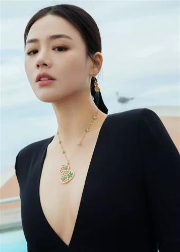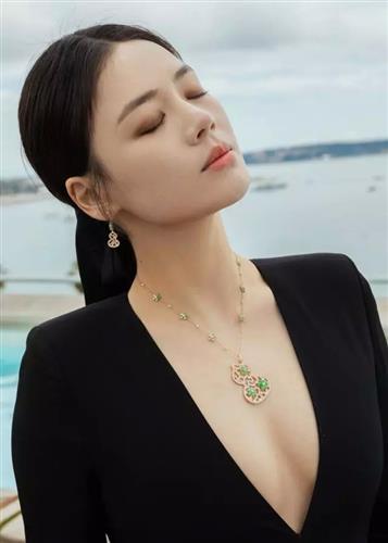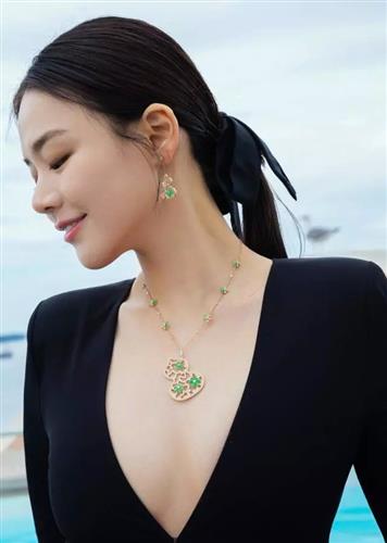 她佩戴着自己代言的品牌翡翠珠宝,优雅大气。
