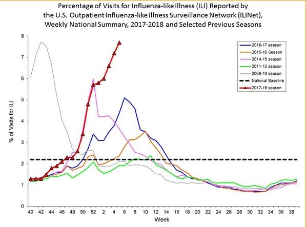 有专家预计,这次可能会成为美国几十年来最严重的流感爆发,CDC代理主任Anne Schuchat表示,其严重程度和2009年猪流感高峰时相当,甚至还有可能超过2003年流感大爆发,成为近期美国最严重的流感季。目前流感的感染比例为7.7%,已经达到了猪流感最严重时的水平。