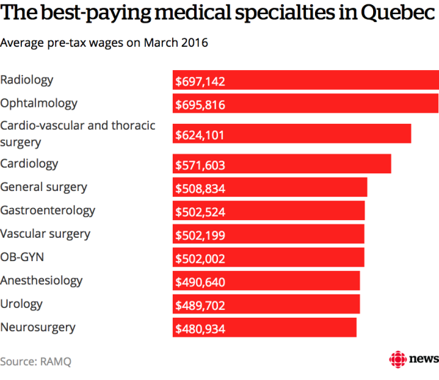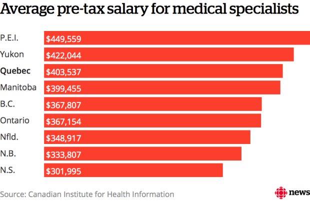 根据加拿大卫生信息中心 (Canadian Institute for Health Information) 统计的数据,现在,魁北克省专科医生每人每年的平均收入为 40万3537加元,而安大略省的平均收入为 36万7154加元。