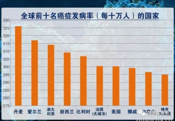 根据世界癌症研究基金会的数据,2011年全球前十名癌症发病率(每十万人)的国家为:丹麦(326);爱尔兰(317);澳大利亚(314);新西兰(309);比利时(307);法国(301);美国(300);挪威(299);加拿大(297);捷克(295)”。