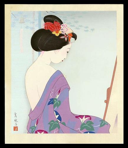 这个从古老的艺妓文化中就表现得淋漓尽致。日本有一种起源于江户时代的绘画艺术形式,叫做浮世绘(pictures of the floating world),描绘的大多是日本人生活的日常和风景,其中很大一部分就同艺妓有关。在浮世绘里,在古老的京都城中,艺妓在华丽的和服下优雅地露出了背部👇