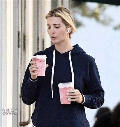 等待女儿上课时,伊万卡去附近的星巴克买了两杯粉色饮料,这是给女儿和她的小伙伴买的。伊万卡耳朵里戴着耳机,向车边走去,边走边端起一杯饮料喝了几口。