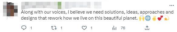 “除了发声,我们还需要解决方案、想法、方法和设计来改变我们在这个美丽星球上的生活方式。”