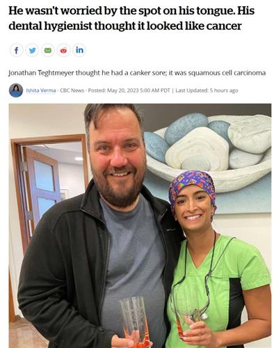 “这是咋回事?”洗牙师关心地问。乔纳森却不以为然地说,哦,没事,就口腔溃疡了。乔纳森一样都不担心。就这小白点,过几天不就消了吗,不会有啥影响。不过,卜罗奇受过口腔癌筛查的培训,她觉得,情况并没有乔纳森说的那么简单——舌头上的异样有点红,又有点白,边界也不规则。