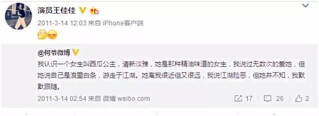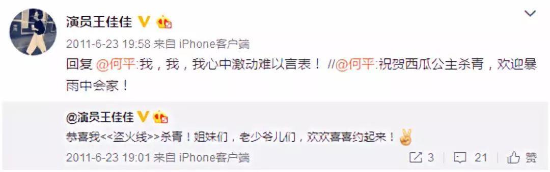 近几年呢,何平导演的微博上倒是不再出现“西瓜公主”的字样的,但是依旧会帮忙宣传王佳佳的新剧,用词也严肃了许多。