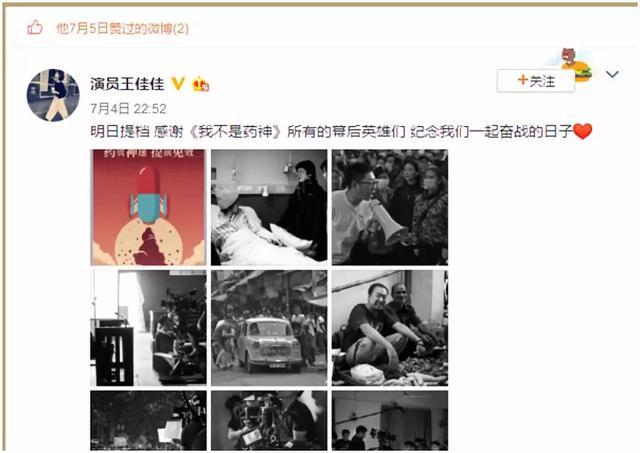 在《我不是药神》上映以来,不仅多次在微博上为影片打call,还点赞了王佳佳的微博。