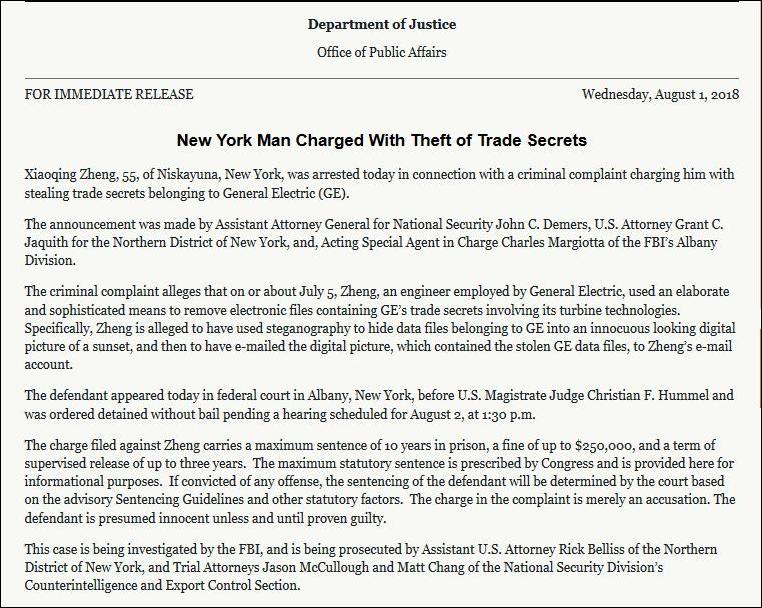 据美国司法部发布的公告,7月5日左右,郑小清使用复杂而又精密的手段,获取了通用电气公司有关涡轮技术的秘密文件。他用加密方式把数据文件隐藏在一张看似平常无奇的“日落照片”中,并发送到了自己的邮箱。 公告称,他可能面临最高10年监禁、25万美元罚款以及3年的监视居住期。![]()