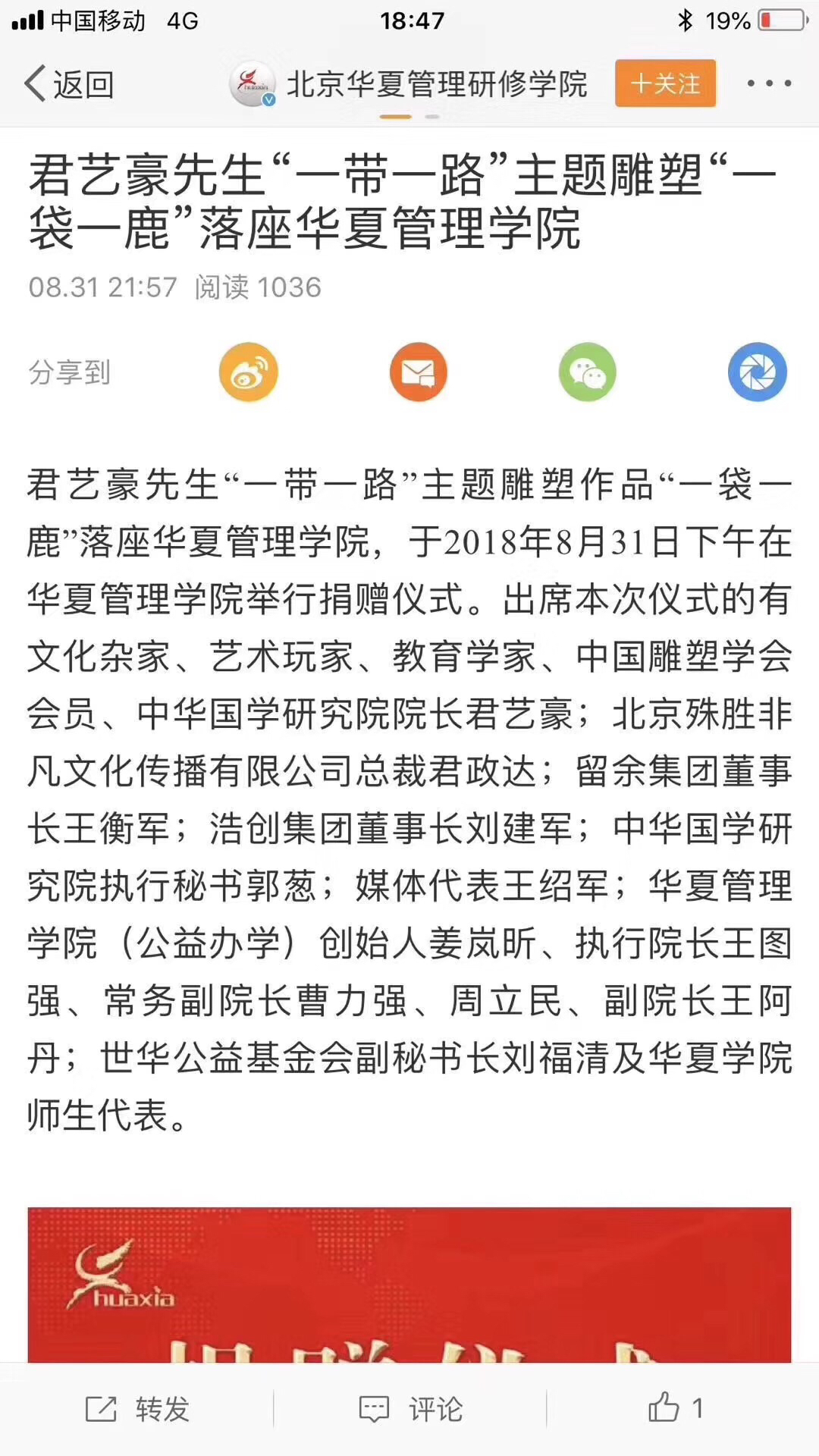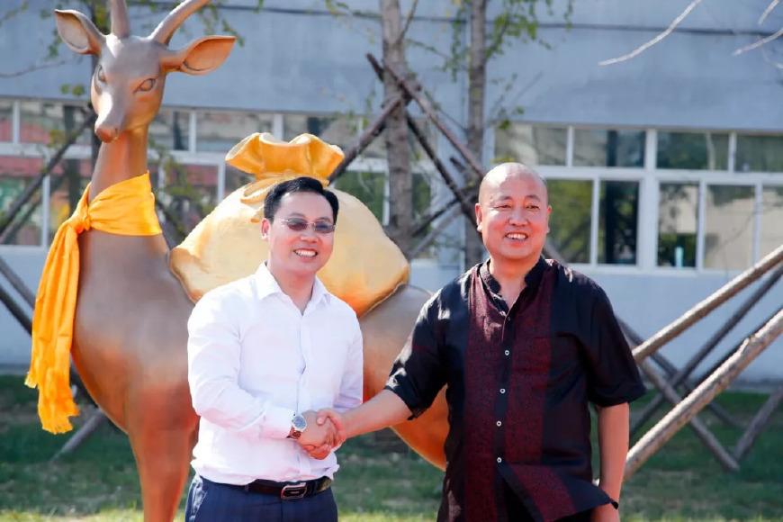 8月31日,据 @北京华夏管理研修学院? 新浪微博官方账号消息,“文化杂家、艺术玩家、教育学家、中国雕塑学会会员、中华国学研究院院长君艺豪”(原文如此)君艺豪先生“一带一路”主题雕塑作品“一袋一鹿”落座华夏管理学院。