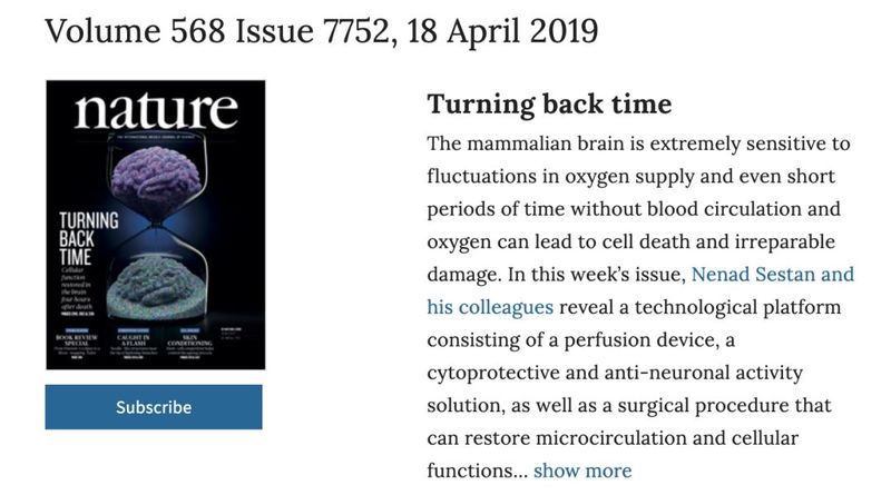 4月18日,Nature封面重磅发布耶鲁大学最新研究:猪大脑在死亡4小时后成功复活,并维持了至少6小时。