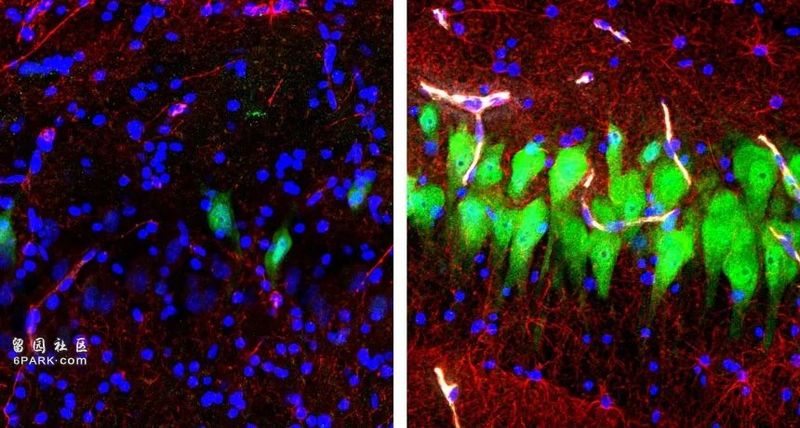 ○ 在死亡的10小时后,猪的大脑的细胞会退化(左),而在通入了Brain Ex系统的脑细胞(右),神经细胞(绿色)星形胶质细胞(红色)会保持健康。| 图片来源:STEFANO G. DANIELE, ZVONIMIR VRSELJA/SESTAN LAB/YALE SCHOOL OF MEDICINE