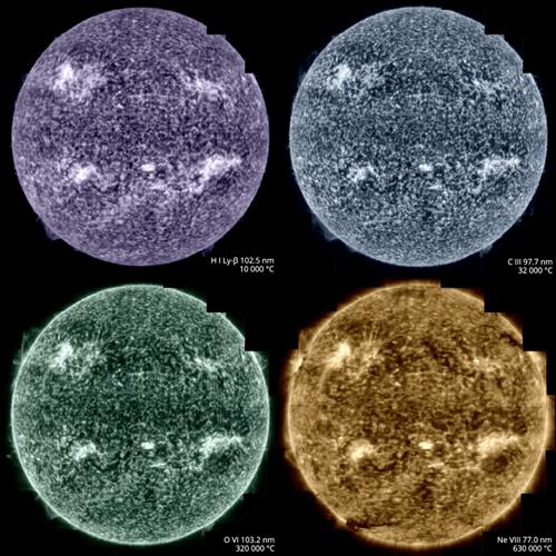 紫色描绘的是10000℃的氢气,蓝色描绘的是32000℃的碳,绿色描绘的是320000℃的氧气,黄色描绘的是630000℃的氖。这类见解将帮助科学家了解温度是如何通过太阳的大气层上升的,反过来说,日冕的温度要比表面的温度高得多(约5000℃)。