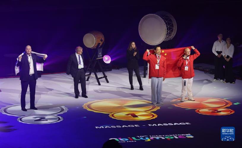 3月25日,在法国梅斯举行的第十届国际残疾人职业技能竞赛中,在按摩项目分获冠军、季军的中国选手王俊(左四)和王经府(左五)上台领奖。新华社记者 高静 摄