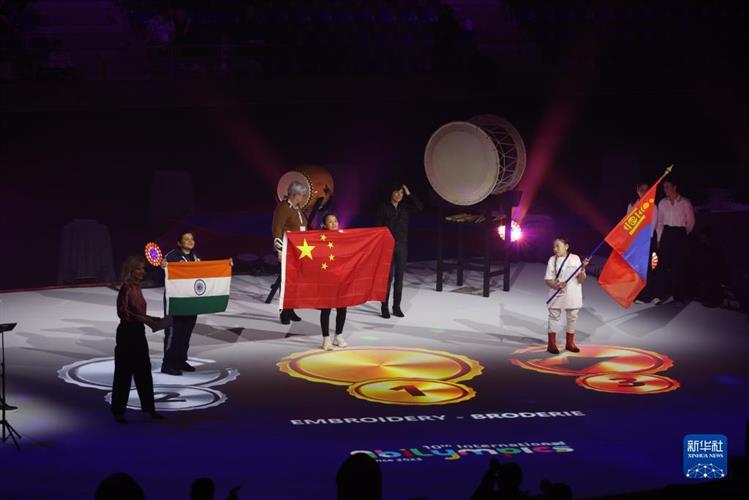 3月25日,在法国梅斯举行的第十届国际残疾人职业技能竞赛中,在刺绣比赛中夺冠的中国选手布云秀上台领奖。新华社记者 高静 摄