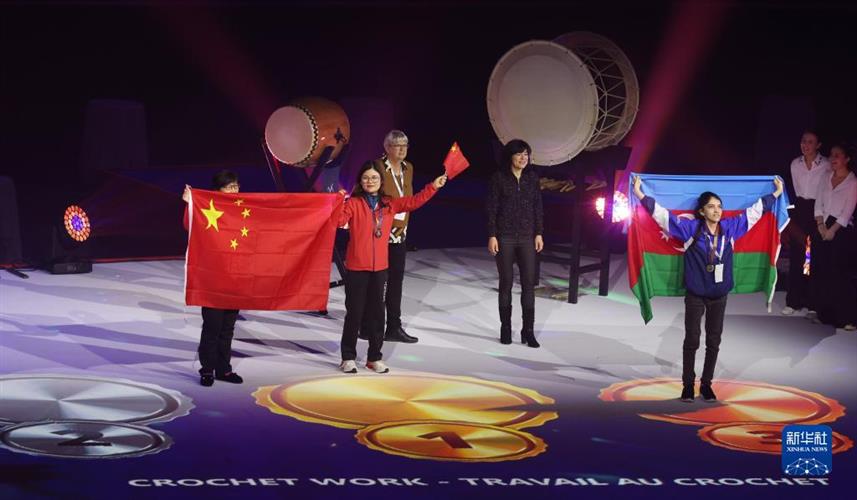 3月25日,在法国梅斯举行的第十届国际残疾人职业技能竞赛中,在钩针编织比赛中分获冠亚军的中国选手胡春芳(左二)和沙红英(左一)上台领奖。新华社记者 高静 摄