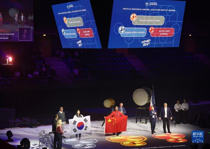 3月25日,在法国梅斯举行的第十届国际残疾人职业技能竞赛中,在食物雕刻比赛中夺冠的中国选手郑云海上台领奖。新华社记者 高静 摄