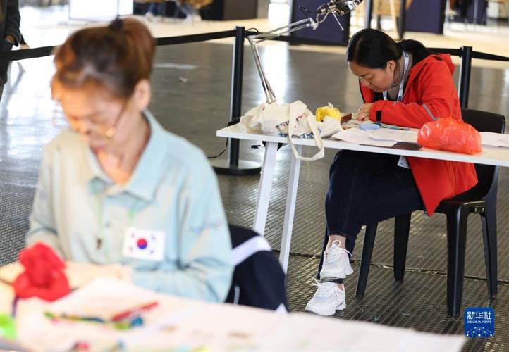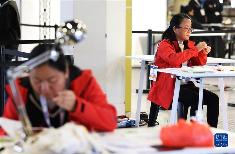 3月25日,在法国梅斯举行的第十届国际残疾人职业技能竞赛中,最终获得冠军的中国选手布云秀(右)参加刺绣比赛。新华社记者 高静 摄