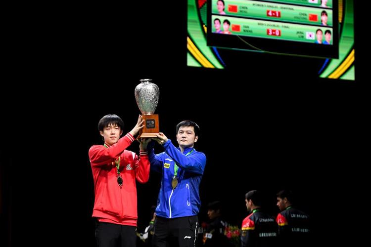 5月27日,冠军中国组合樊振东(右)/王楚钦在颁奖仪式上高举奖杯庆祝。新华社记者 李亚辉 摄