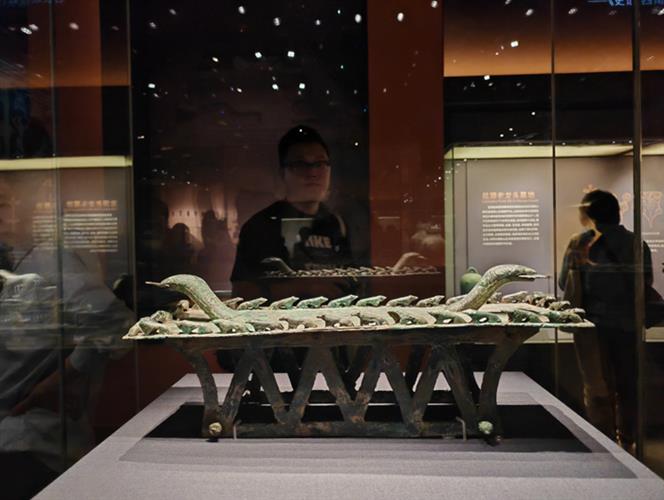 在成都金沙遗址博物馆“吉金万里——中国西南地区青铜文明展”展出的纺织场面铜贮贝器(局部)(5月26日摄)。 新华社记者 童芳 摄