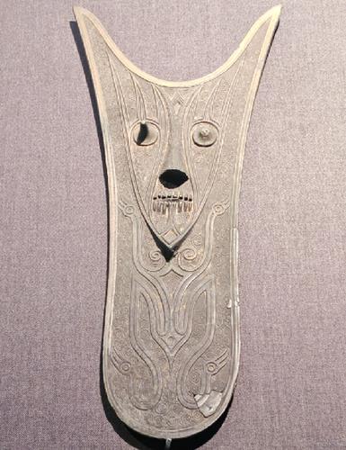 在成都金沙遗址博物馆“吉金万里——中国西南地区青铜文明展”展出的人面鱼形四鸟纹铜当卢(5月26日摄)。 新华社记者 童芳 摄