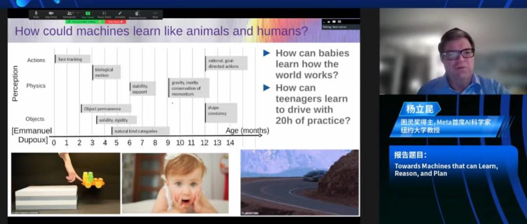 杨立昆表示,如果向5个月大的婴儿展示将小汽车从平台上推下来,婴儿不会感到惊讶,但是10个月大的婴儿会非常惊讶。