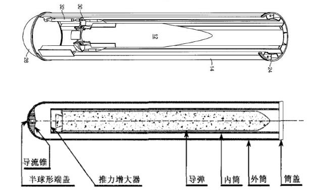 同心贮运发射筒很重要的特点,即取消了由多个发射筒公用的燃气排导通道而采用自持式燃气排导系统。它利用两个同心圆筒间的空隙作为燃气排放管道,燃气通过发射管底板的排气口排出。