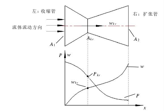 (拉瓦尔喷管结构及流体增速原理示意图)