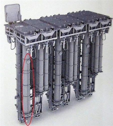 (限制传统“冷”垂发装置长度的瓶颈在于活塞气缸(红圈处)的长度无法被轻易缩短,而导弹的长度则短于发射筒长度,造成了发射筒尺寸、重量的浪费)
