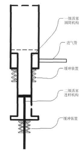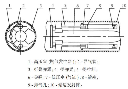 中国研发者提出了双级气缸式弹射装置的设计方案: 其整体结构不变 ,而把弹射缸的长度尺寸减小为整个筒长的1/3左右,再把其中的活塞连杆机构做成活塞圆筒机构作为第一级;圆筒中再套接1个活塞连杆机构,作为弹射器的第二级。发射装置工作时,高压燃气首先进入弹射装置的第一级活塞圆筒机构,使其随着低压室压力的升高而向上运动;当第一级活塞撞到缓冲器止动后,高压燃气通过圆筒上的进气孔进入第二级活塞连杆机构,此时的低压室变为第二级活塞和第二级活塞之后的空间,随即第二级活塞向前运动,直至撞到缓冲器止动为止。