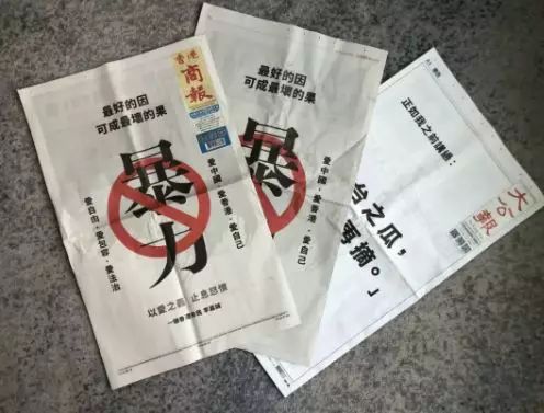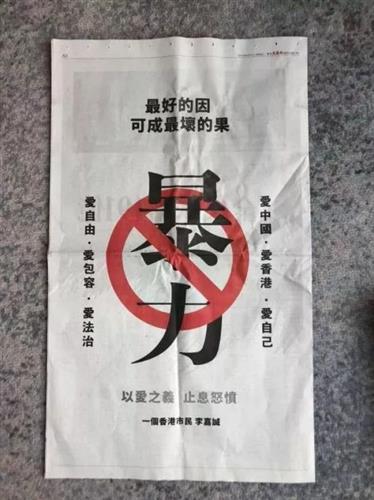 而刊登在香港《文汇报》《香港商报》等媒体上的广告,李嘉诚用了大白话方式——顶头是“最好的因可成最坏的果”,中间一个红色的禁止标识盖在“暴力”二字之上,左右两边分别写着“爱中国 爱香港 爱自己”与“爱自由 爱包容 爱法治”,下方则写有“以爱之义 止息怒愤”,署名同样是“一个香港市民李嘉诚”。