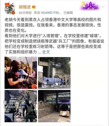 老胡今天看到黑衣人占领香港中文大学等高校的图片和视频,很是震惊。在我看来,香港的事态发展很快,性质也在变化。