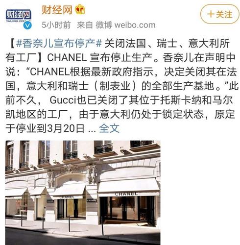 香奈儿3月18日宣布停止生产,将关闭在法国、意大利、瑞士的所有工厂预计关闭时间将持续2周!