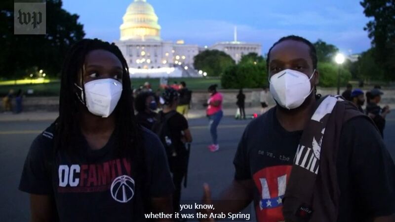 除了白宫,国会山也沦陷了。有部分抗议者在傍晚时从白宫转战国会大厦,在门口阻挡警车。有抗议者在接受采访时说:“我们讨厌这样,但是我们理解,那是必须经历的部分……不管这是不是阿拉伯之春,或者其他类似的事情,有时候你必须要让事情发展到这种程度。”他们的背后,是夜幕里的国会山。