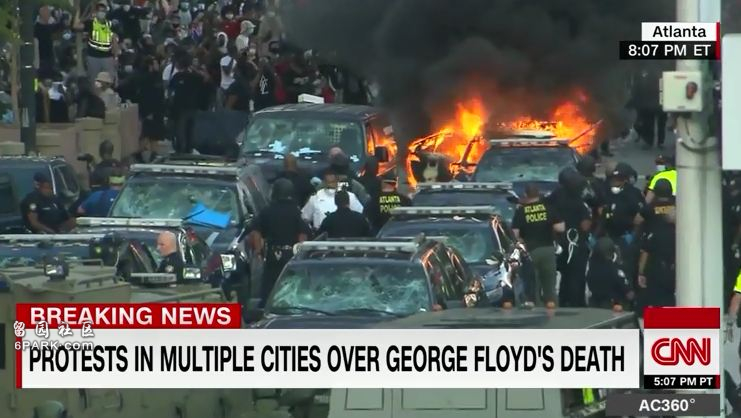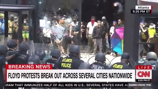 29日,亚特兰大的抗议活动因为CNN,成了明尼阿波利斯之外的另一焦点。CNN表示,亚特兰大的抗议活动在29日下午早些时候开始,一开始比较和平。到了下午6点左右,抗议者开始向聚集了很多警察的CNN总部大楼移动,该大楼里有一个亚特兰大警察局分局。