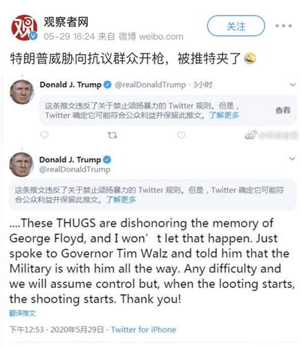 美国总统特朗普在推特上指责抗议群众,并将“抗议者”统统划分为“暴徒”,随后这条推文竟被推特封了。