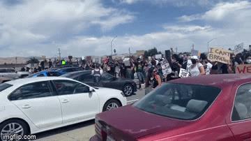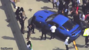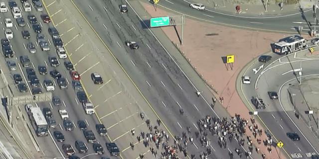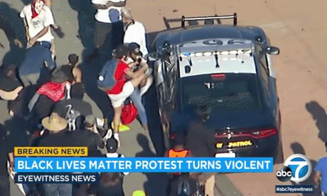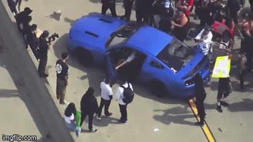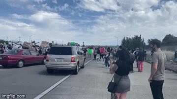 然而,愤怒的游行者中,有人完全失去了理智!这是被围堵的101公路。仿佛每个路上的车都是有罪的。