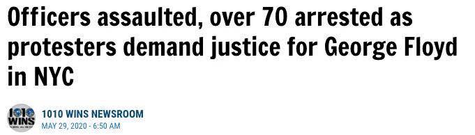 纽约市警察局长告诉记者,截止周五上午,在这些暴力示威抗议行动中共有72人被逮捕,其中五人因“袭警”而获重罪。