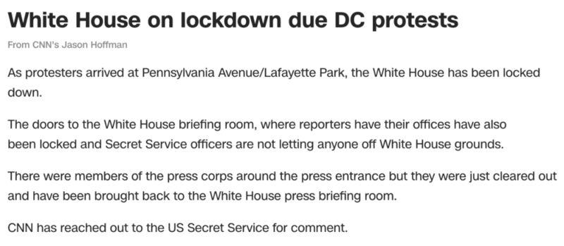 白宫一度被特勤局封锁,封锁期间,数十名记者被困在白宫西翼。其中一名被困记者发布在推特的照片显示,有身穿防暴服的警察进入白宫椭圆办公室所在的西翼。