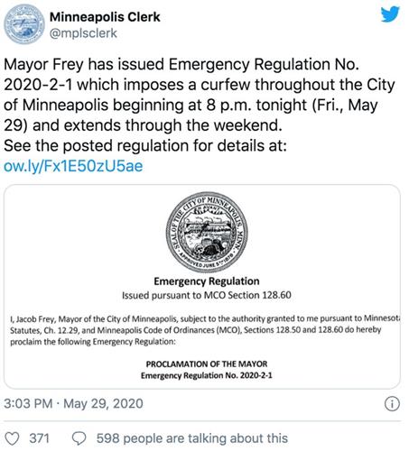 周五下午,明尼苏达州包括Minneapolis市多地在内宣布将执行宵禁,呼吁和平。