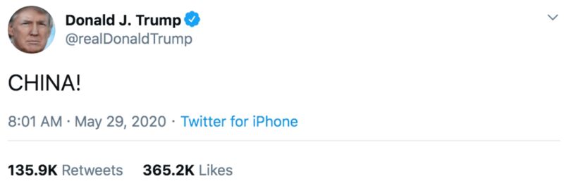 美国东部时间下午4时,特朗普在白宫举办了一场与中国有关的新闻发布会。特朗普在发布会上闭口不提美国国内由于警察暴力执法而导致种族问题愈演愈烈的现实问题,却张口闭口指责中国对于香港问题的处理。