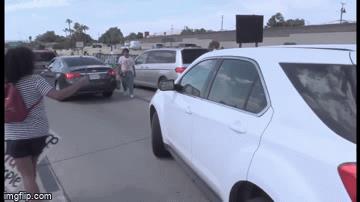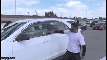 然而,这还不是网络上唯一的砸车。这辆白色雪弗莱,一位女示威者,用脚猛烈踢踹。