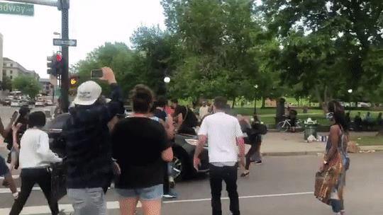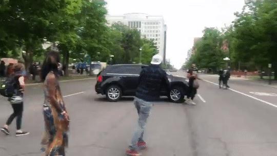 当地时间28日,在美国丹佛举行的一次悼念遇害非洲裔乔治·弗洛伊德的集会上,一辆汽车撞入人群,抗议者冒死截停失败。