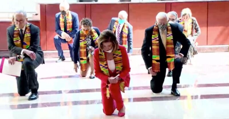 拜登向黑人单膝下跪,民主党领袖佩洛西也下跪——整整8分49秒(警察跪杀弗洛伊德的时间)