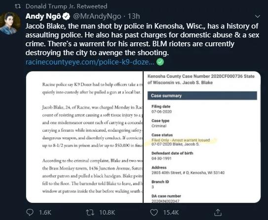推文称:布莱克曾因在酒吧对另一位顾客拔枪而被捕。逮捕期间,布雷克先生对一名警官造成了“软组织损伤”。因此布莱克有“殴打警察的历史”。他被指控拒绝逮捕,醉酒时持枪,以及行为不检。