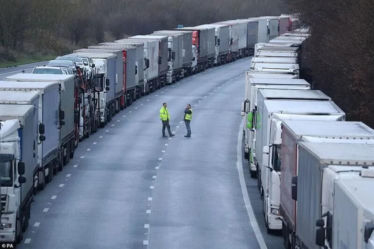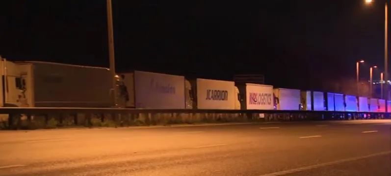 肯特郡俨然变成了一个巨大的停车场,目前在通往多佛港口的高速公路上有多达1500辆卡车堵在路上,进退两难。