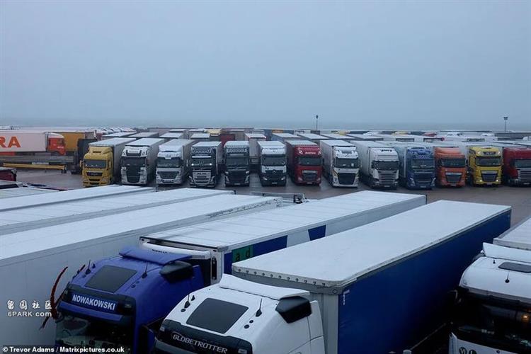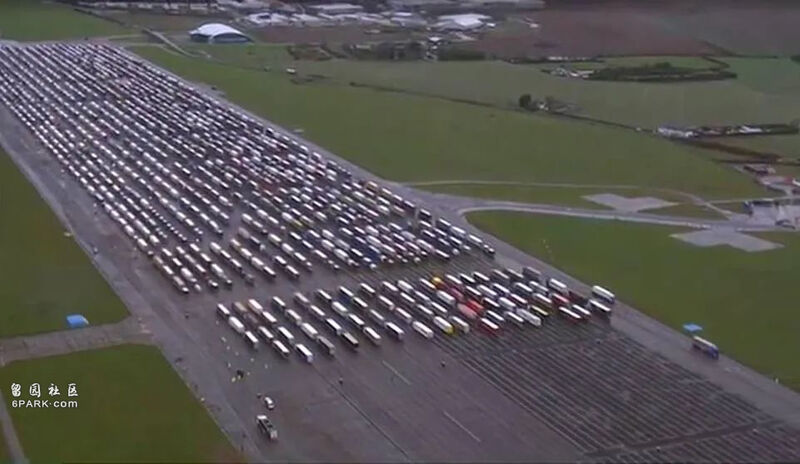 还有大量卡车停在肯特郡的曼斯顿机场上。这个废弃场地原本计划作为英国脱欧后的应急停车场,没想到现在就已经派上了用场。