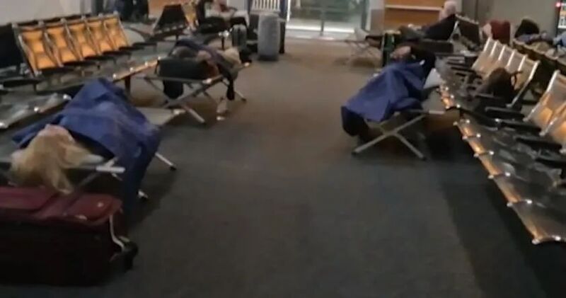 ▲ 滞留旅客在机场行军床上睡了一晚。(推特截图)