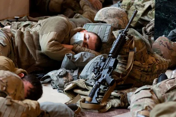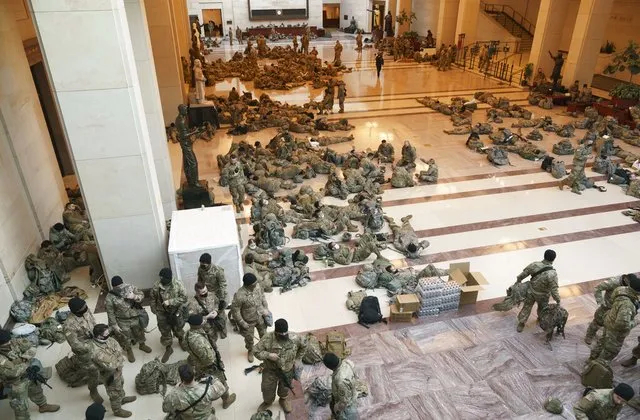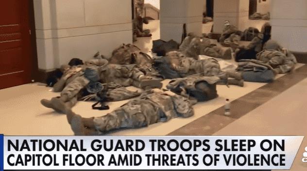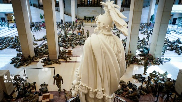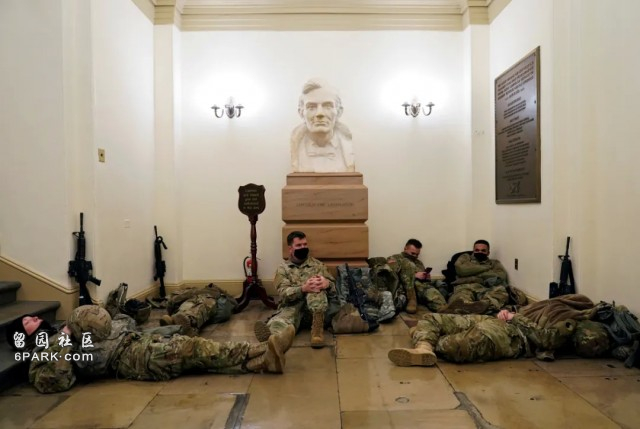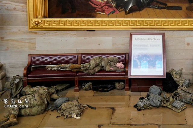 通宵执勤的大兵们直接睡在了国会山的地板上。