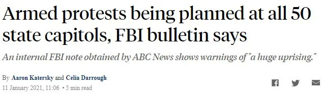 美国FBI警告称,有组织策划在1月20日前几天或当天,在首都华盛顿和全美50个州举行武装抗议。